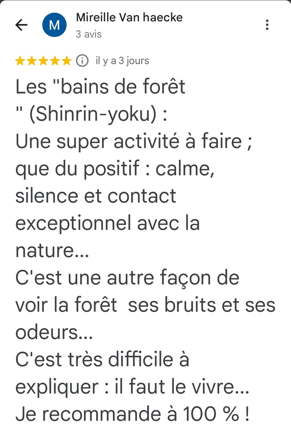 C'est une expérience à laquelle j'aimerais à nouveau participer et que je ne peux que recommander chaudement à toute personne ayant besoin d'un bain de nature pour se recentrer ! 🌱"